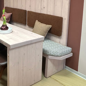 De indeling is gespiegeld, zodat je bij binnenkomst direct de nieuwe zithoek ziet. Eigen ontwerp trouwens, gemaakt in de sociale werkplaats (kussens by KAAR) Het bureau krijgt een plek in het midden van de ruimte, bij het raam, met zicht op buiten en de gehele ruimte, zo zit je tevens net voor de muur en dat geeft rust voor een betere focus. Trendy roze- en bruintinten voor de muren benadrukken de nieuwe indeling en brengen de oude kasten, het bureau en zelfs de vloer bij elkaar, de meubels gaan op in de achtergrond. Deze ruimte is gestyled met een botanische muurschildering en passen we de trend van organische vormen toe in de zelfgemaakte wandcircels. De vintage items zorgen voor extra sfeer.